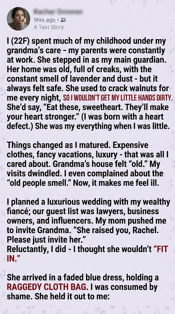 The scent of lavender and old dust suddenly wafted up from the open cloth bag. It didn’t smell “old” anymore. It smelled like absolute, unconditional safety. It smelled like home. It smelled like the sacrifice of a woman who spent her golden years living with almost nothing so I could have everything, even when I treated her like dirt.