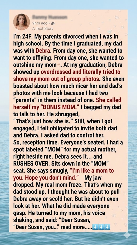 My parents divorced when I was in high school, and my dad quickly remarried Debra—a woman who seemed more interested in replacing my mom than joining our family. She called herself my “bonus mom,” but her actions were anything but loving. From the start, she tried to outshine my mother, showing up to my graduation in a glittery gown and pulling me away from Mom in photos. She even called my mom afterward to gloat.
