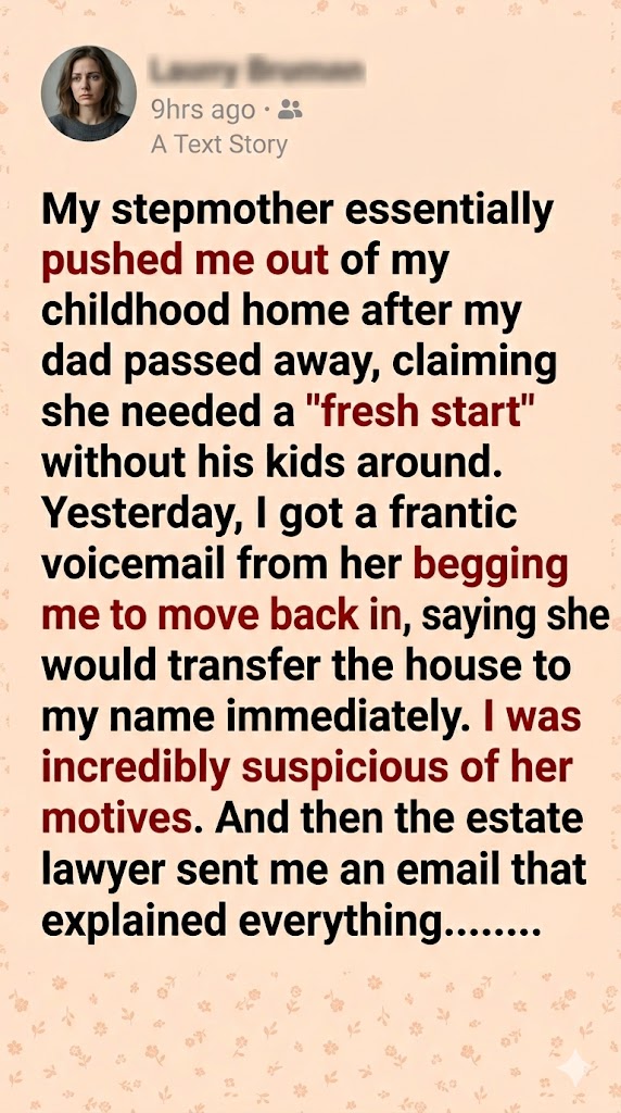 “Please, you have to come back,” she had pleaded, her voice trembling. “I was wrong. I was just grieving, I wasn’t thinking straight! I’ll sign the deed over to you today. Just bring your suitcases, please, I need you here by tomorrow afternoon!”