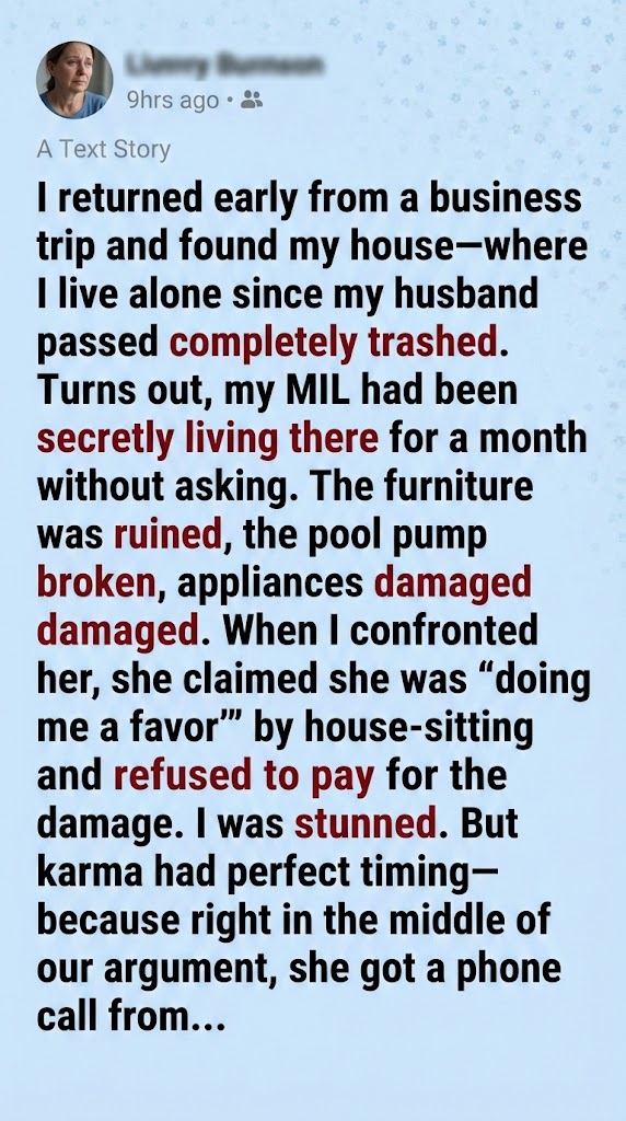 “You just told me you were doing me a favor,” I reminded her. “You refused to pay for the thousands of dollars in damage you caused to my sanctuary. You broke the pool pump, ruined the floors, and trashed the furniture my husband and I picked out together. You didn’t treat this place like a home; you treated it like a dumpster.”