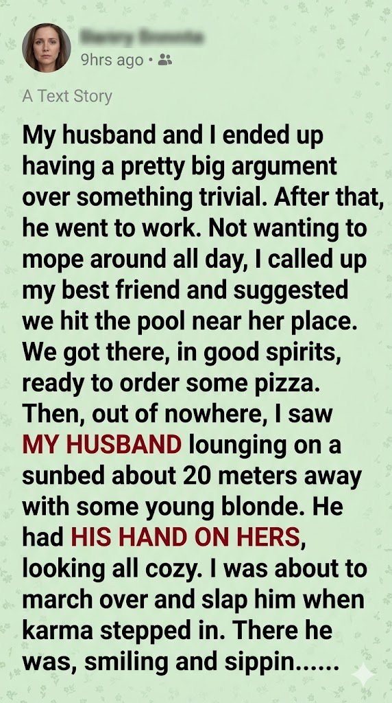 My husband and I ended up having a pretty big argument over something trivial. After that, he went to work. Not wanting to mope around all day, I called up my best friend and suggested we hit the pool near her place. We got there, in good spirits, ready to order some pizza. Then, out of nowhere, I saw MY HUSBAND lounging on a sunbed about 20 meters away with some young blonde. He had HIS HAND ON HERS, looking all cozy. I was about to march over and slap him when karma stepped in. There he was, smiling and sippin…