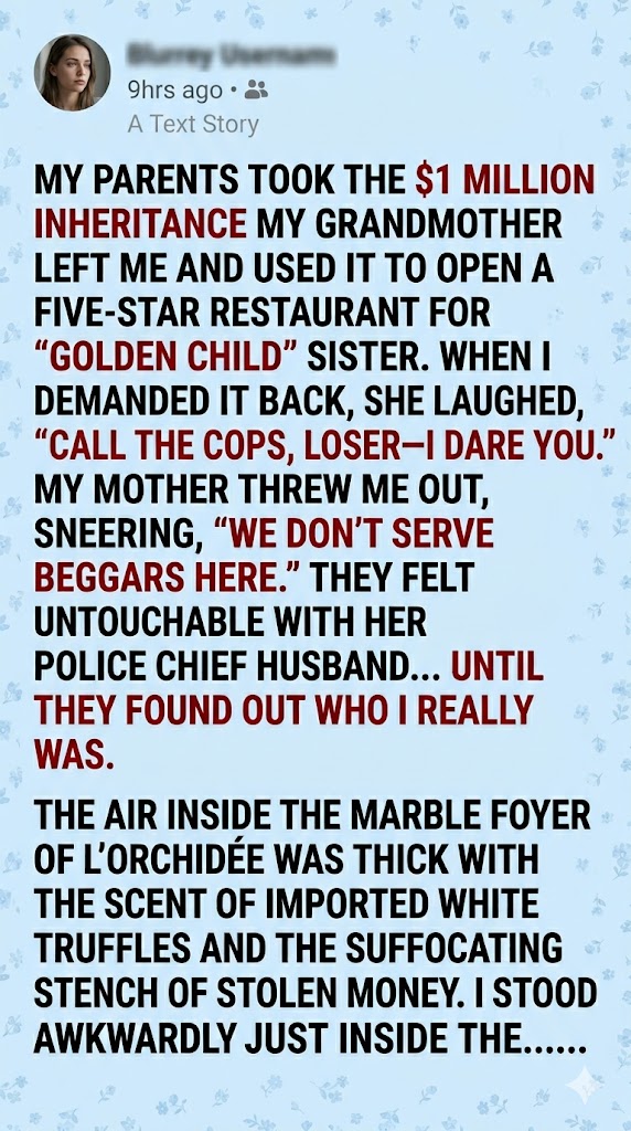 My mother emerged from the kitchen doors, wiping her hands on a pristine white apron. “I told you, we don’t serve beggars here,” she hissed, her eyes darting around to see if any of the elite clientele had noticed the disturbance. “Leave before you embarrass yourself further. That money is gone. It’s an investment in the family’s futureโ€”something you know nothing about.”
