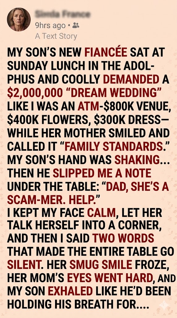 “Excuse me?” the fiancรฉe stammered, her sugary-sweet veneer cracking instantly. Her manicured hands gripped the edge of the table so tightly her knuckles turned white.