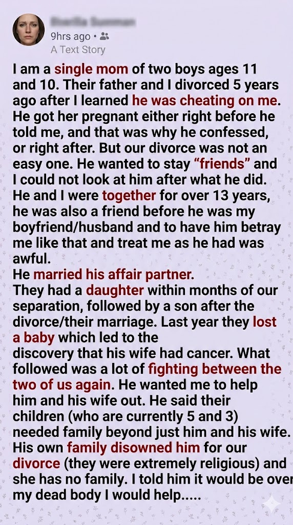 Last year they lost a baby which led to the discovery that his wife had cancer. What followed was a lot of fighting between the two of us again. He wanted me to help him and his wife out. He said their children (who are currently 5 and 3) needed family beyond just him and his wife. His own family disowned him for our divorce (they were extremely religious) and she has no family. I told him it would be over my dead body I would help.