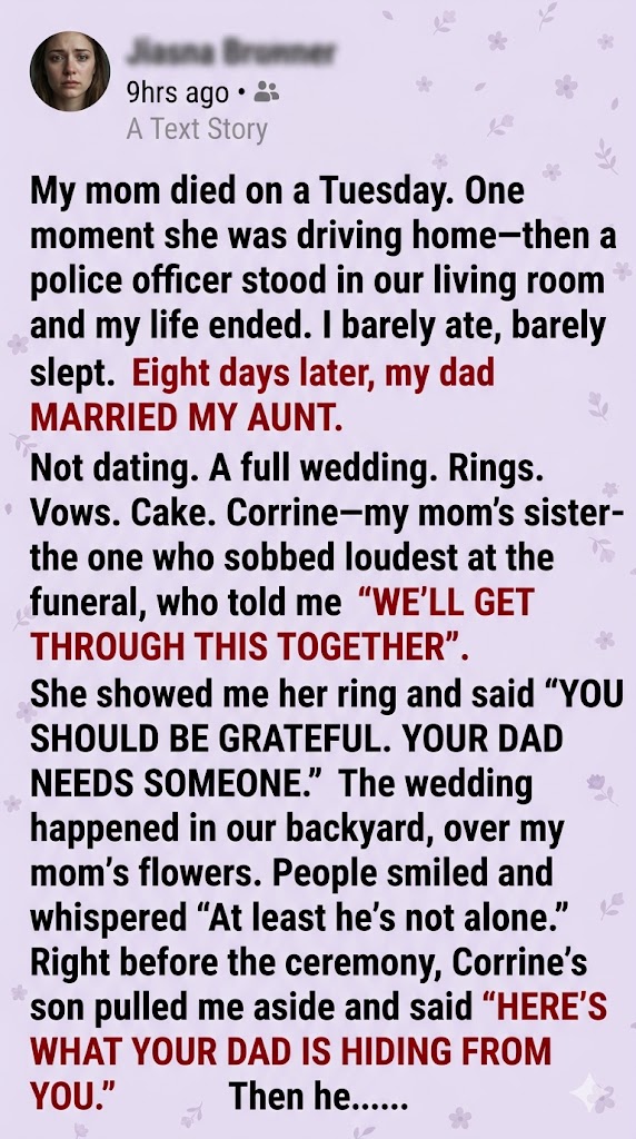 My dad married my aunt exactly EIGHT DAYS after my mom’s funeral… but my cousin just exposed their sickest secret right before the vows. 💔🚨 Wait until you see what I did at the altar. You will NOT believe this ending.
