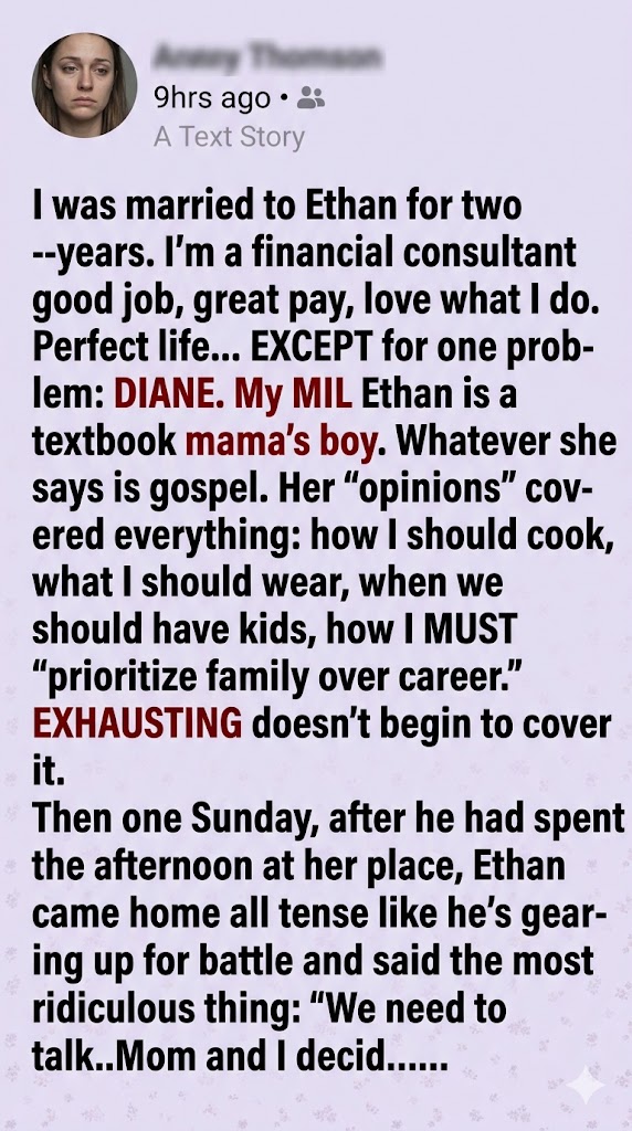 Six months later, the divorce was finalized. I got a promotion, kept my peace, and enjoyed my beautifully quiet, Diane-free home. And Ethan? He got exactly what he asked for: his mommy, full-time.