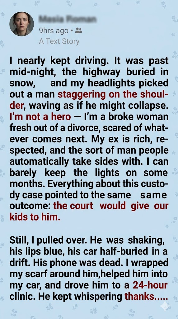 I didn’t stay long at the clinic. Once the triage nurses rushed him onto a gurney and wrapped him in thermal blankets, I quietly slipped out the sliding glass doors. I had a grueling morning shift at the diner the next day, and a mountain of terrifying legal paperwork waiting on my kitchen table. I didn’t leave my name. I didn’t think I had done anything extraordinary, and frankly, my mind was too consumed by the sheer terror of losing my children to dwell on the stranger in the snow.