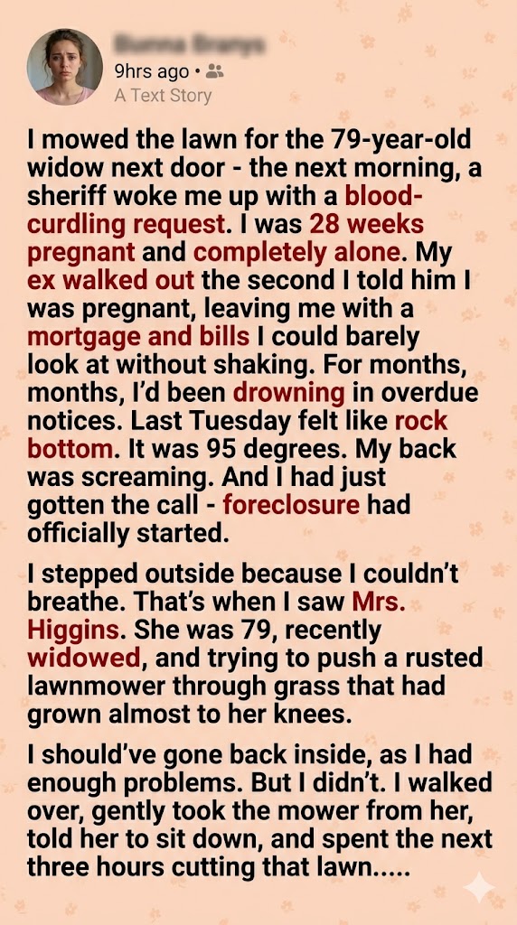 When I finally shut the mower off, the silence was deafening. Mrs. Higgins was sitting on her porch chair, holding out a trembling glass of iced tea. We didn’t talk much. She just looked at me with these watery, knowing eyes, patted my hand, and whispered, “You have a good heart, child. The universe doesn’t ignore things like that.”