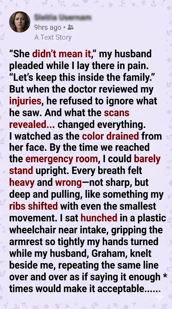 “She didn’t mean it,” my husband pleaded while I lay there in pain. “Let’s keep this inside the family.” But when the doctor reviewed my injuries, he refused to ignore what he saw. And what the scans revealed… changed everything. I watched as the color drained from her face. By the time we reached the emergency room, I could barely stand upright. Every breath felt heavy and wrongβ€”not sharp, but deep and pulling, like something inside my ribs shifted with even the smallest movement. I sat hunched in a plastic wheelchair near intake, gripping the armrest so tightly my hands turned pale, while my husband, Graham, knelt beside me, repeating the same line over and over as if saying it enough times would make it acceptable.