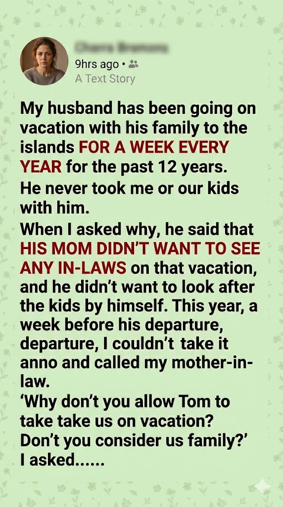 “Darling, what are you talking about?” my mother-in-law asked, genuinely perplexed. “My husband and sons go on vacation every year, but they’ve never taken me with.