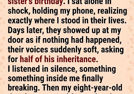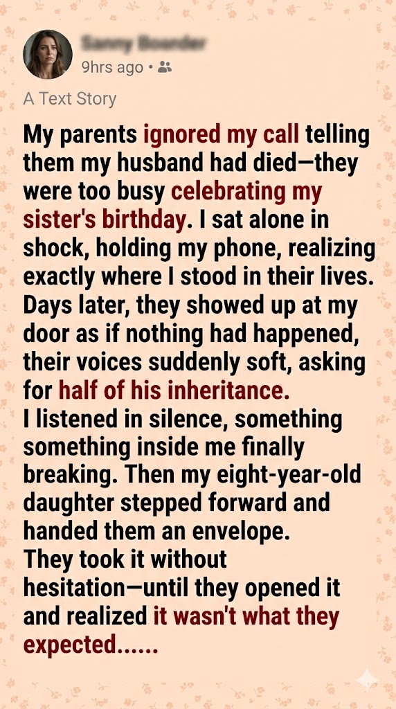My parents ignored my call telling them my husband had died—they were too busy celebrating my sister’s birthday. I sat alone in shock, holding my phone, realizing exactly where I stood in their lives. Days later, they showed up at my door as if nothing had happened, their voices suddenly soft, asking for half of his inheritance. I listened in silence, something inside me finally breaking. Then my eight-year-old daughter stepped forward and handed them an envelope. They took it without hesitation—until they opened it and realized it wasn’t what they expected.