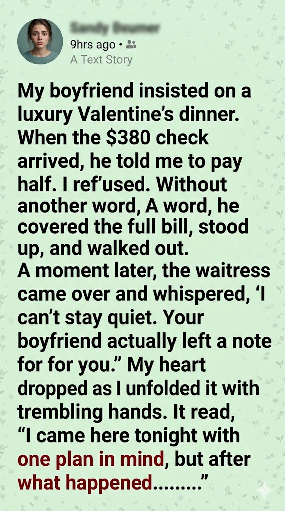 I stared at him, trying to understand. He had planned this entire night. He chose the place. He insisted on the wine. He’d been the one saying, “Tonight’s special.”