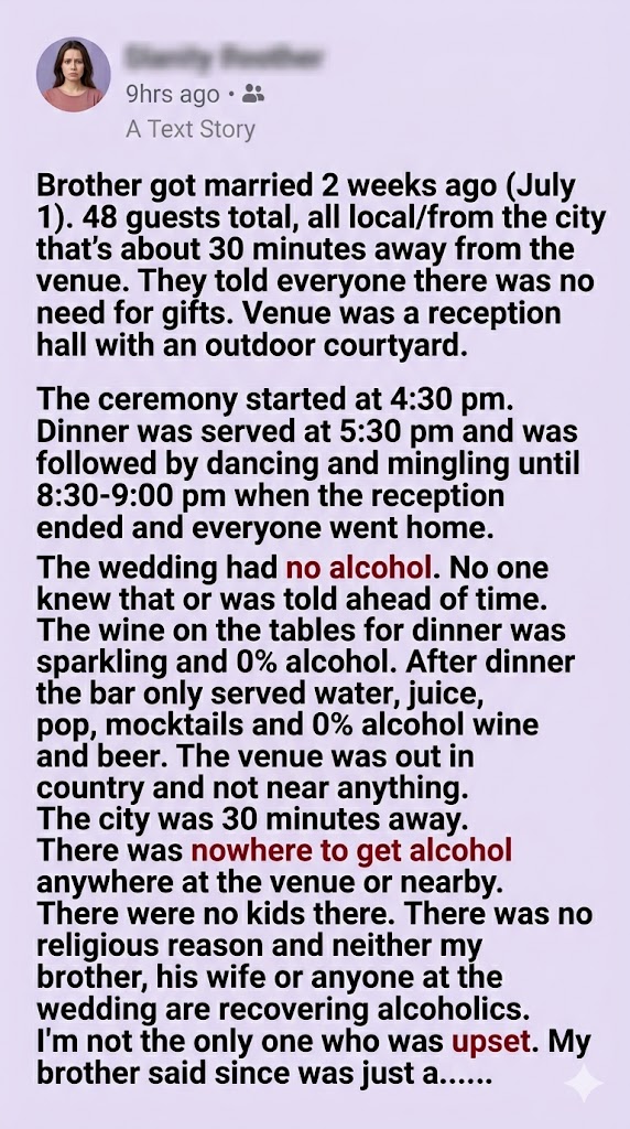 “A surprise dry wedding in the middle of the country isn’t a celebration—it’s a hostage situation with mocktails. 🥂🚫 If you’re skipping the bar, don’t skip the heads-up.