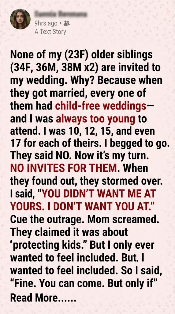 The room went dead silent. My oldest brother stuttered, saying that was unreasonable because they have families now. I laughed and said, “Funny how ‘family’ only matters when itâs convenient for you. When I was 17, I was your sister, but that wasn’t enough for an invite. Now, you want special treatment?”