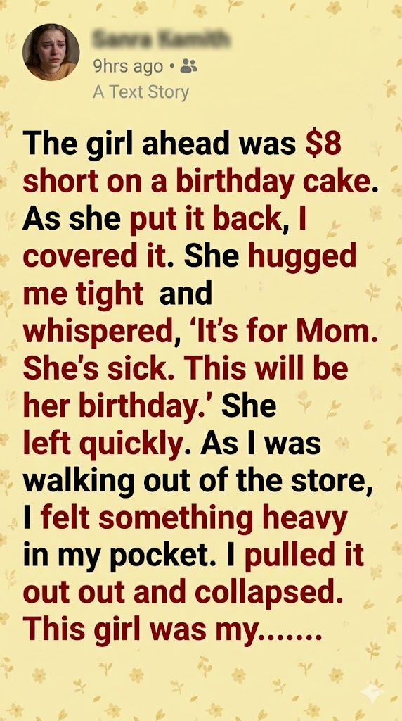 The girl ahead was $8 short on a birthday cake. As she put it back, I covered it. She hugged me tight and whispered, ‘It’s for Mom. She’s sick. This will be her birthday.’ She left quickly. As I was walking out of the store, I felt something heavy in my pocket. I pulled it out and collapsed. This girl was my…
