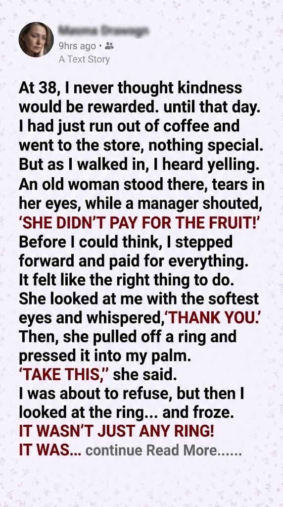 The old woman smiled sadly. “I found it years ago,” she whispered. “Lying in the dirt at a park. I took it to the police, but no one claimed it. I’ve worn it on a chain around my neck ever since, feeling like I was just keeping it safe for someone. Today, for the first time, I put it on my finger. I think I was waiting for you.”