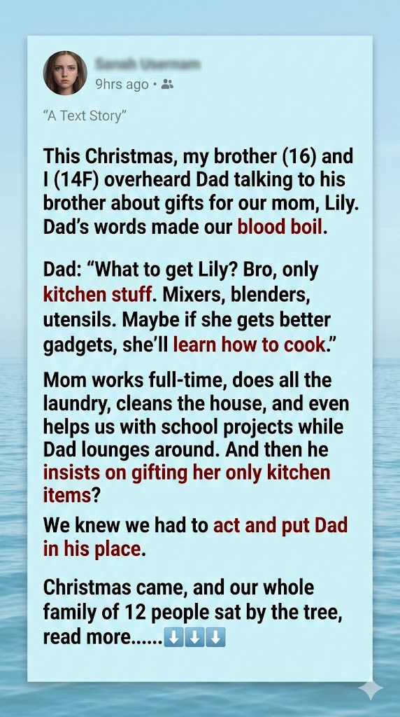 Christmas came, and our whole family of 12 people sat by the tree, the lights blinking softly against the window while snow fell outside. The room smelled like cinnamon and pine. Mom was smiling, handing out cocoa, completely unaware of what Dad had planned — or what we had.