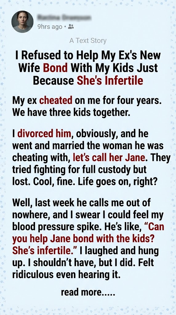 I called my ex back, completely furious. He admitted immediately that it was Jane pushing this. She was trying to “bond” with the kids and get closer to them. I lost it on the phone. I told them both, very clearly, to leave us alone. I made it extremely plain that her emotional state and personal issues regarding fertility were not my problem, and they certainly were not my children’s responsibility.