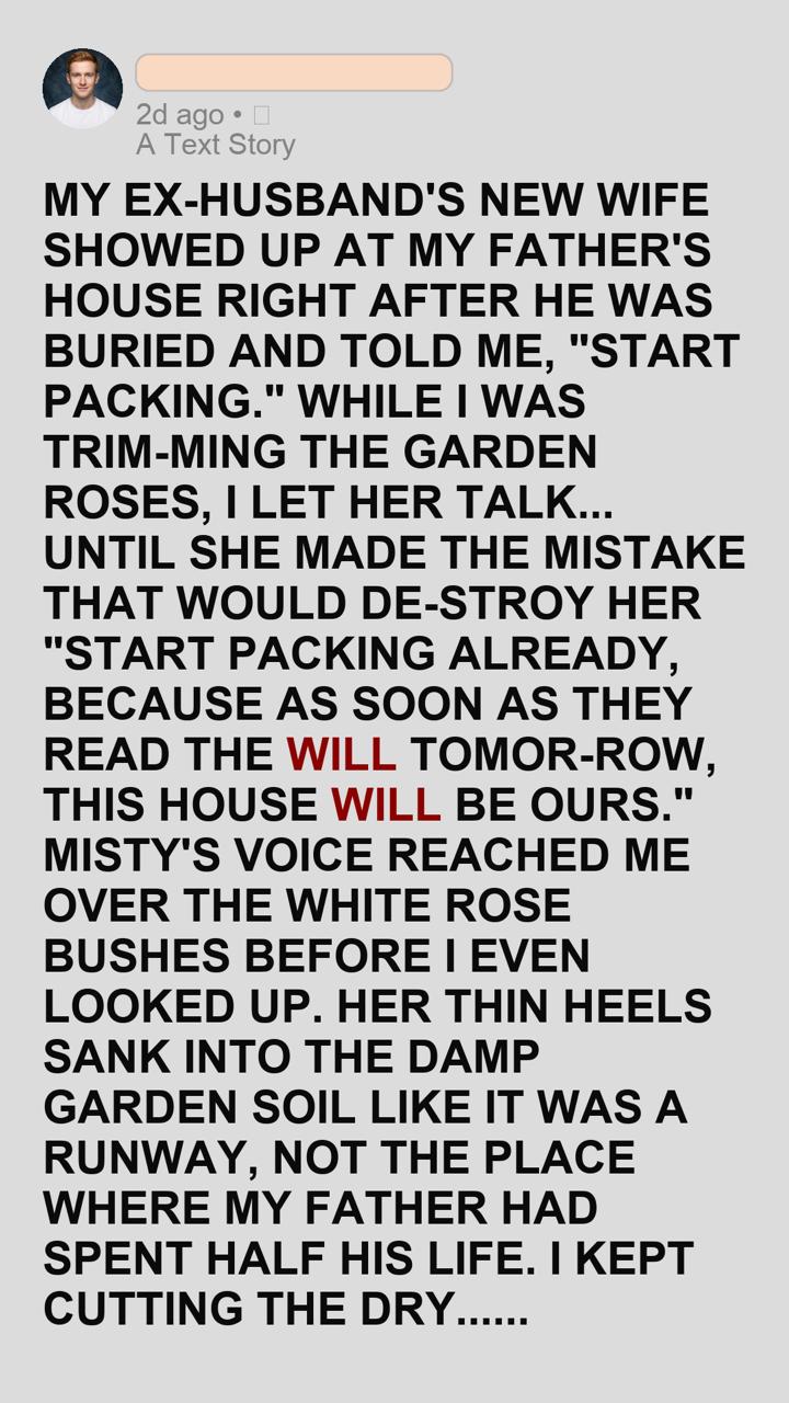 I carefully pruned a dead head off the Juliet rose bush, my father’s absolute favorite. “The will reading is tomorrow at noon, Misty,” I said, my voice barely above a whisper. “Until then, you are trespassing.”