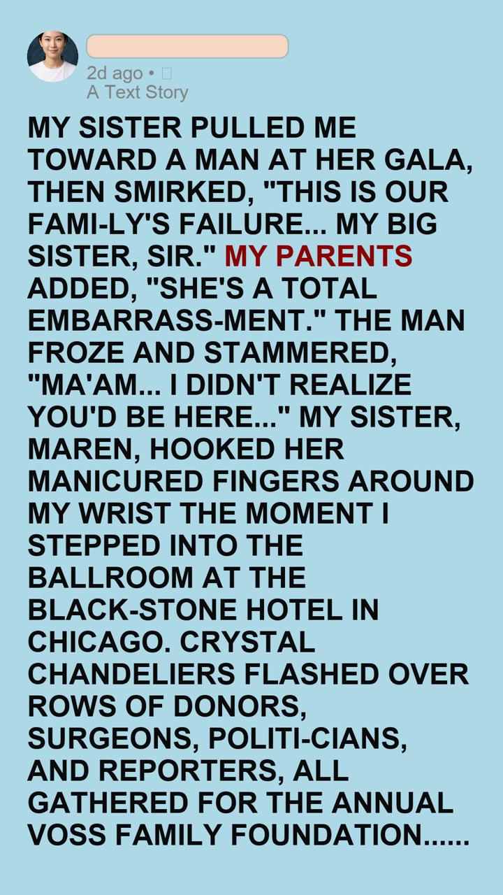 My sister, Maren, had hooked her manicured fingers around my wrist the moment I stepped into the ballroom at the Blackstone Hotel in Chicago. Crystal chandeliers flashed over rows of donors, surgeons, politicians, and reporters, all gathered for the annual Voss Family Foundation dinner.
