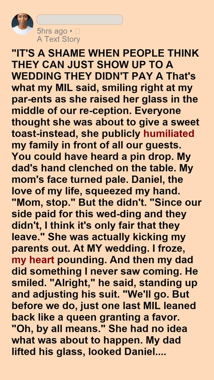 “Since our side paid for this wedding, and you didn’t,” my dad echoed her exact words back to her flawlessly, “I think it’s only fair that you leave.”