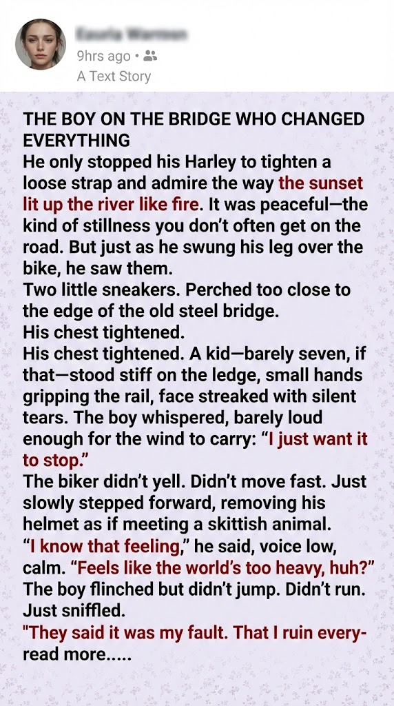 I only stopped my Harley that evening because I needed to tighten a loose strap and, honestly, to admire the way the sunset lit up the river. It looked like fire reflecting off the water. It was peaceful, a kind of stillness you don’t often get when you live life on the open road. But just as I swung my leg over the bike, I saw them. Two little sneakers, perched dangerously close to the edge of the old steel bridge.