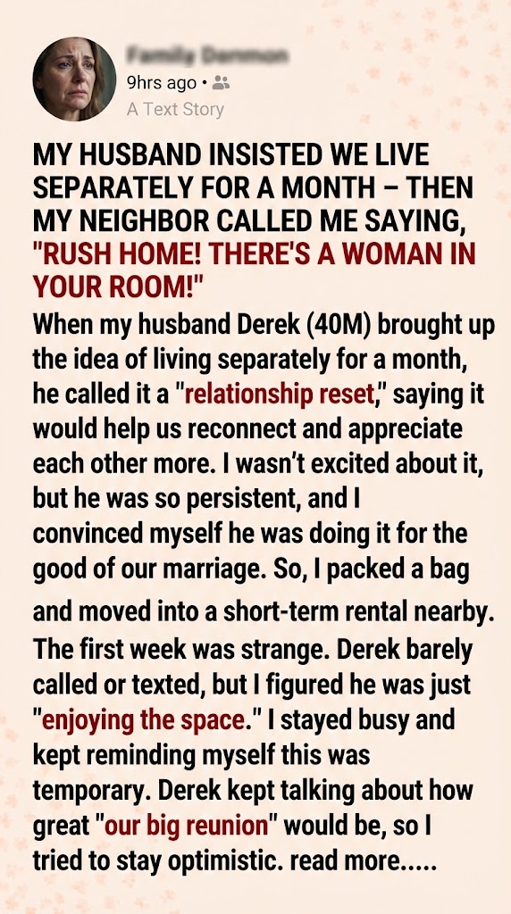 When Derek suggested we live apart for a month to “reignite our relationship,” I didn’t want to agree. It sounded like a ridiculous modern trend couples try when they are struggling but won’t just admit it. He made it sound like a grand plan, claiming the space would help us reconnect and truly appreciate each other, saying it would feel like we were dating all over again. I didn’t love the idea, but Derek was utterly insistent, and I knew fighting him would just make him lose his mind. So, reluctantly, I packed a bag, moved to a rental across town, and told myself that this temporary, forced separation would somehow be fine for the best.