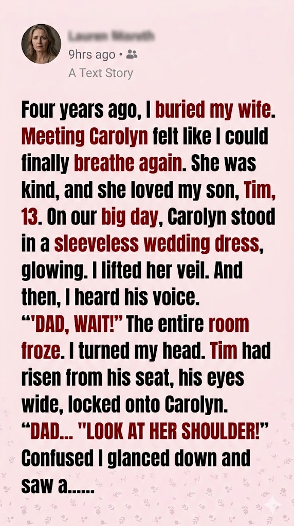 I looked back up at Carolyn. The glowing, radiant bride I had been looking at seconds ago was gone, replaced by a ghost trembling in white tulle. Her eyes darted frantically around the room, and she instinctively brought a hand up to cover the mark on her skin.