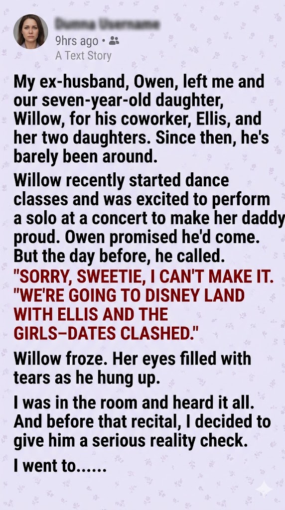 The next evening, Willow stepped onto the brightly lit stage. She looked breathtaking in her sequined costume. For a brief second, her eyes scanned the dark audience, a flicker of that lingering disappointment crossing her face. But then, she found me sitting in the very front row, beaming with enough pride for two parents.