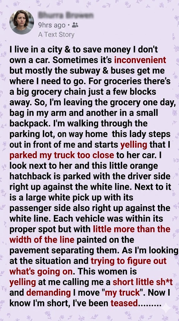 I stepped around her and kept walking. She spun around, yelling a fresh wave of creative insults at my back about my height, my attitude, and my “terrible parking job.”