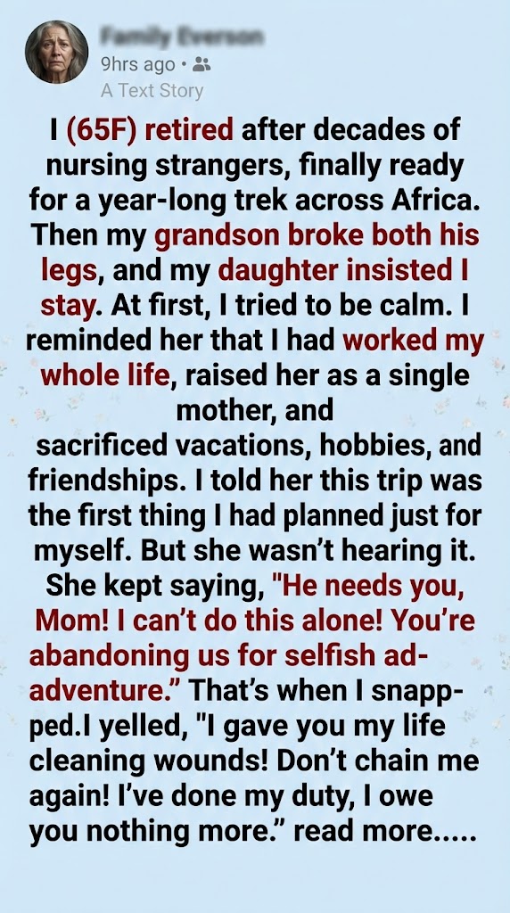 But she wasn’t listening to logic; she was consumed by fear and stress. She kept repeating, “You’re abandoning us for some selfish adventure!” That word, selfish, cut me deeper than she could ever know. After 65 years of devoted giving, being called selfish was the final blow. That’s when I snapped. I yelled, “I gave you my whole life! I spent decades cleaning wounds and dealing with crises! Don’t you dare try to chain me again! I have done my duty; I owe you nothing more!” The shocking tension in the room was unbearable. Her face went cold instantly, and she hissed back the two words that sealed the conflict: “Go, then.”
