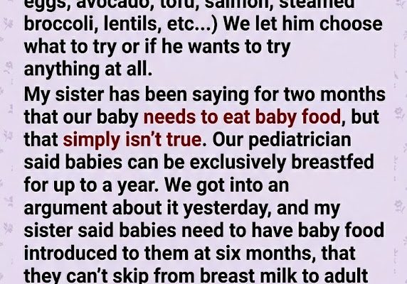 My sister, Claire, crossed her arms, her face flushing an angry shade of crimson. “You’re just being stubborn. Sarah is probably exhausted from nursing all the time, and you’re forcing this whole crunchy, hipster parenting style on her instead of just buying a jar of mashed peas like a normal person.”