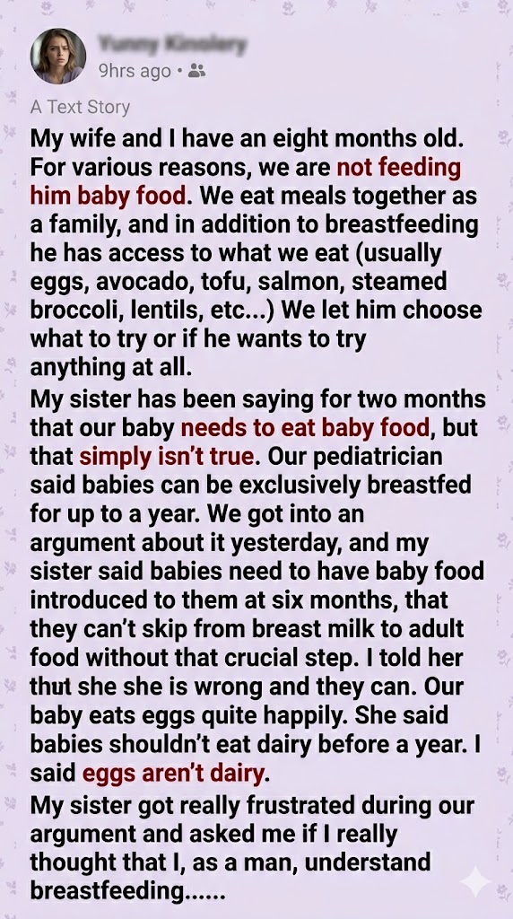 My sister, Claire, crossed her arms, her face flushing an angry shade of crimson. “You’re just being stubborn. Sarah is probably exhausted from nursing all the time, and you’re forcing this whole crunchy, hipster parenting style on her instead of just buying a jar of mashed peas like a normal person.”