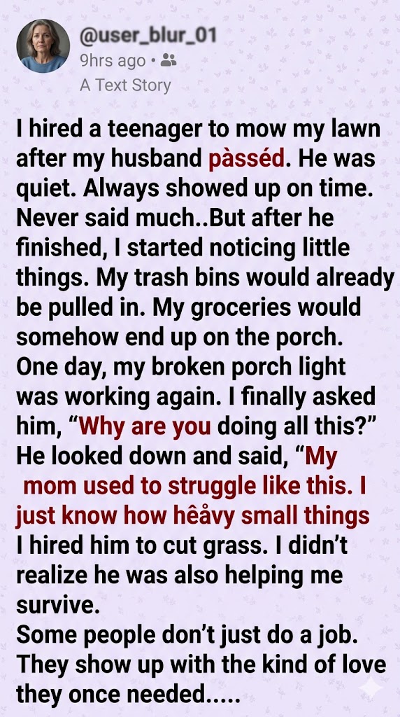 The air between us completely shifted. I realized in that moment that he wasn’t just a teenager working for pocket money, and I wasn’t just a lonely widow giving him a chore. I had hired him to cut grass, but I didn’t realize he was also helping me survive.