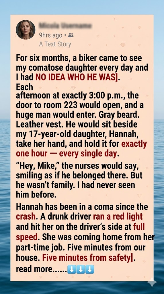 The biker — Mike, apparently — would nod at the nurses, pull a chair close to Hannah’s bed, and take her hand.