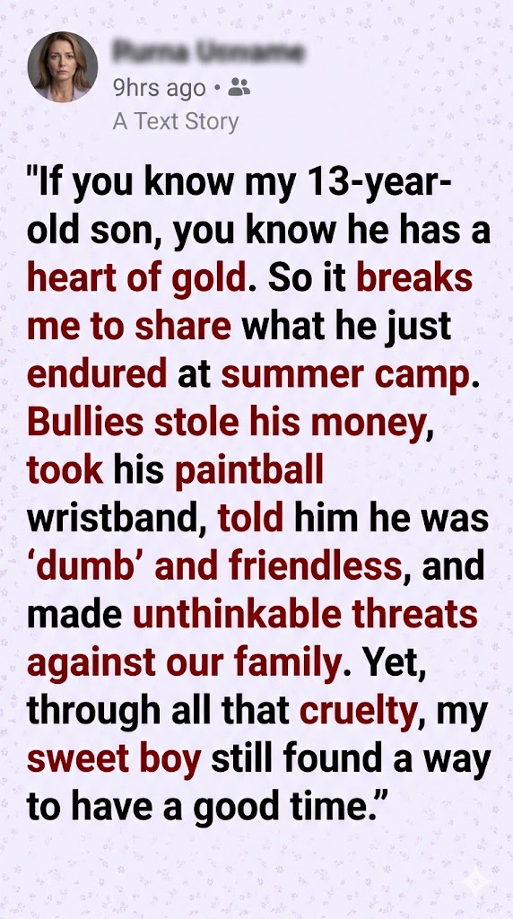 While he was in the shower, they rifled through his bag and took the $40 he had saved from mowing lawnsβ€”money he was so excited to spend at the camp trading post. The next day, they cornered him by the mess hall and physically tore the bright green paintball wristband off his arm, laughing as they told him he was too “dumb” to play anyway.