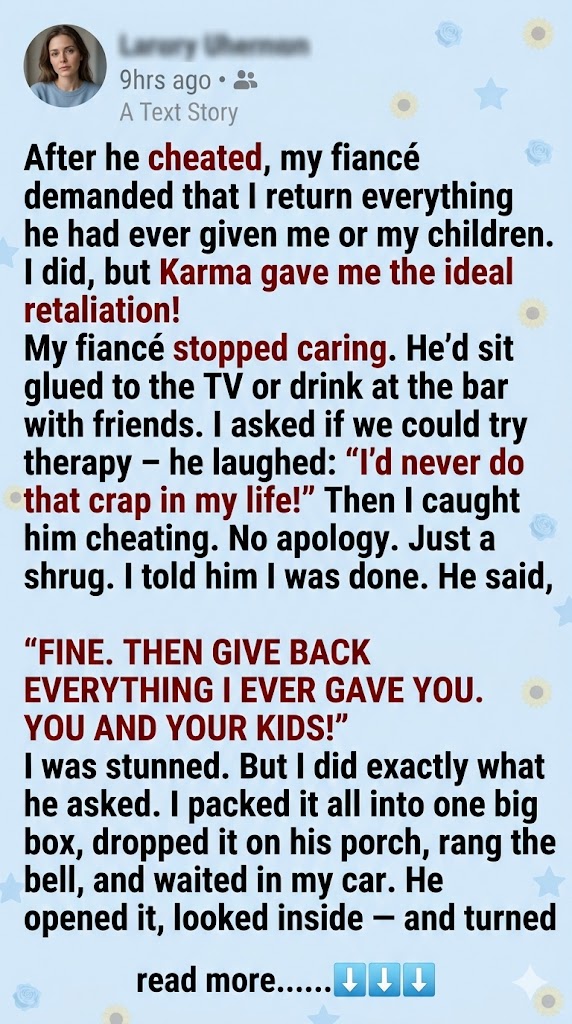 I packed every gift, every token, every trace of him into boxes. I handed them over without tears. Not because I wasn’t hurt—but because I knew something he didn’t: karma doesn’t need help. It just needs time.