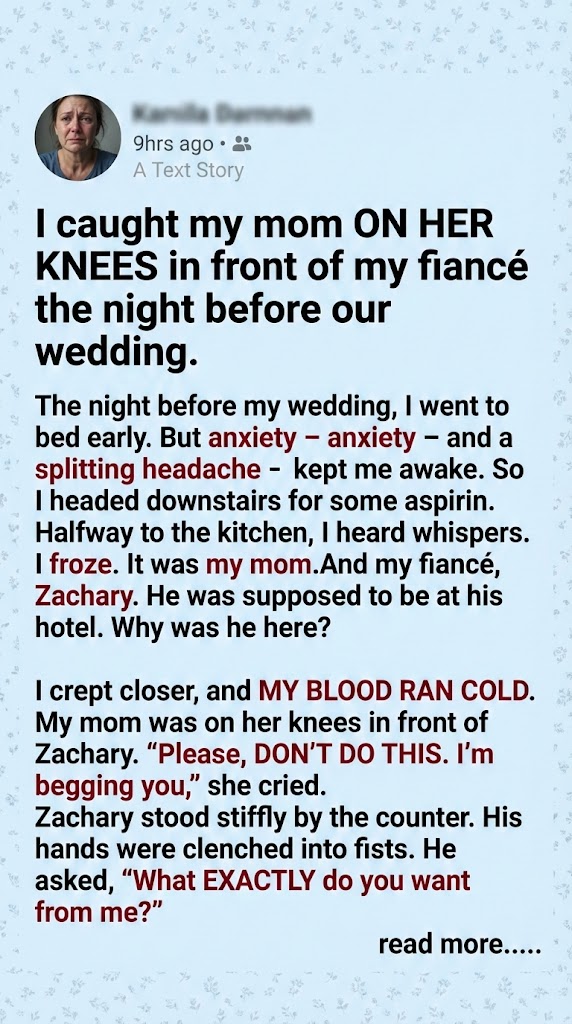 “Kamilla,” my mom breathed, her voice shaking. She immediately put on her ‘mom’ mask—a terrifyingly quick switch. “Honey, you should be asleep. You need your beauty rest for the big day!”