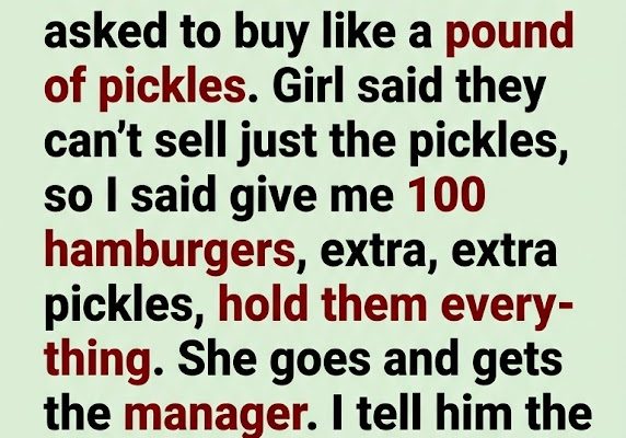 “Company policy says I can’t sell you just the pickles from the line,” he says, wiping his hands on his apron with an utterly deadpan expression. “But I can sell you a bulk condiment replacement tub. That’ll be five dollars and forty-two cents.”