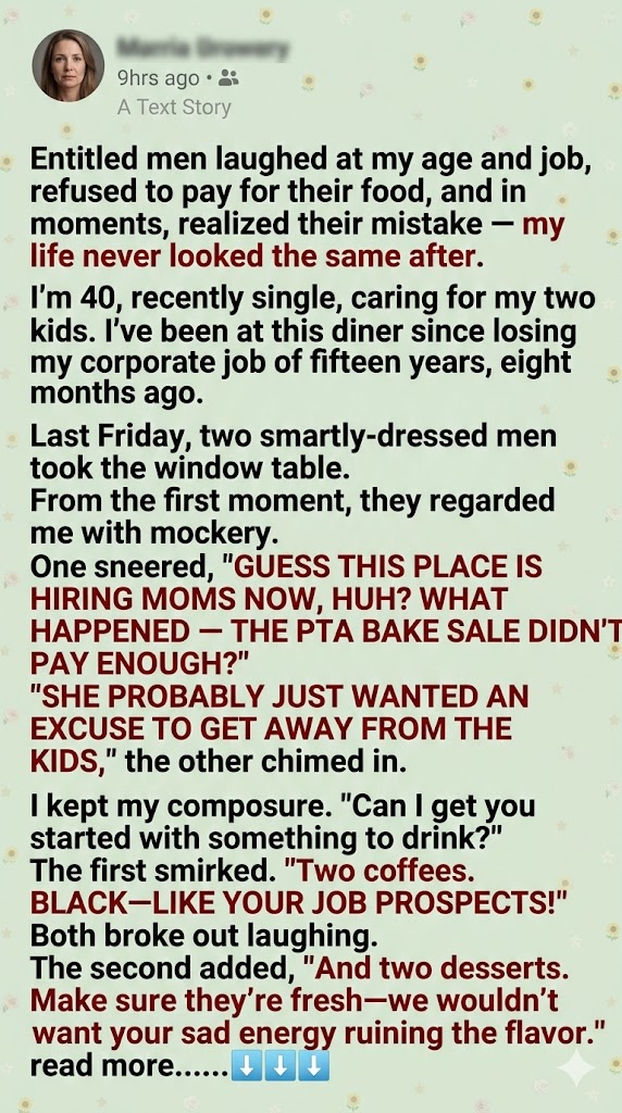 Last Friday, two men in expensive suits walked in and took the window booth. From the second I handed them menus, I felt that look—the one that says you’re just a background character in their important lives. One smirked, “Guess this place is hiring moms now. What happened? The PTA bake sale didn’t pay enough?”