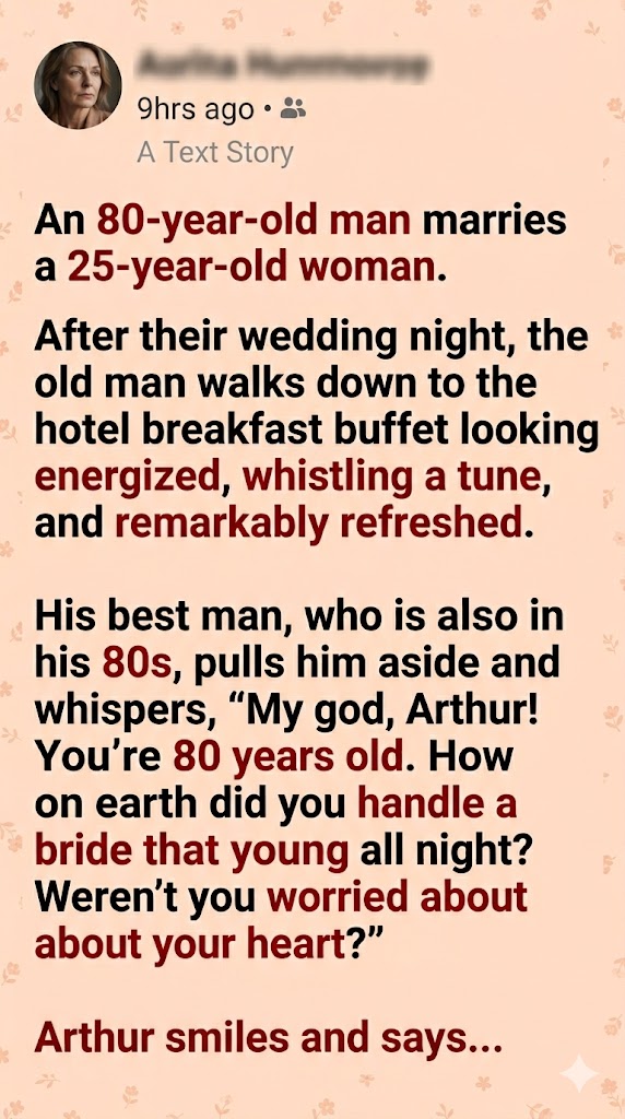 His best man, who is also in his 80s, pulls him aside and whispers, “My god, Arthur! You’re 80 years old. How on earth did you handle a bride that young all night? Weren’t you worried about your heart?”