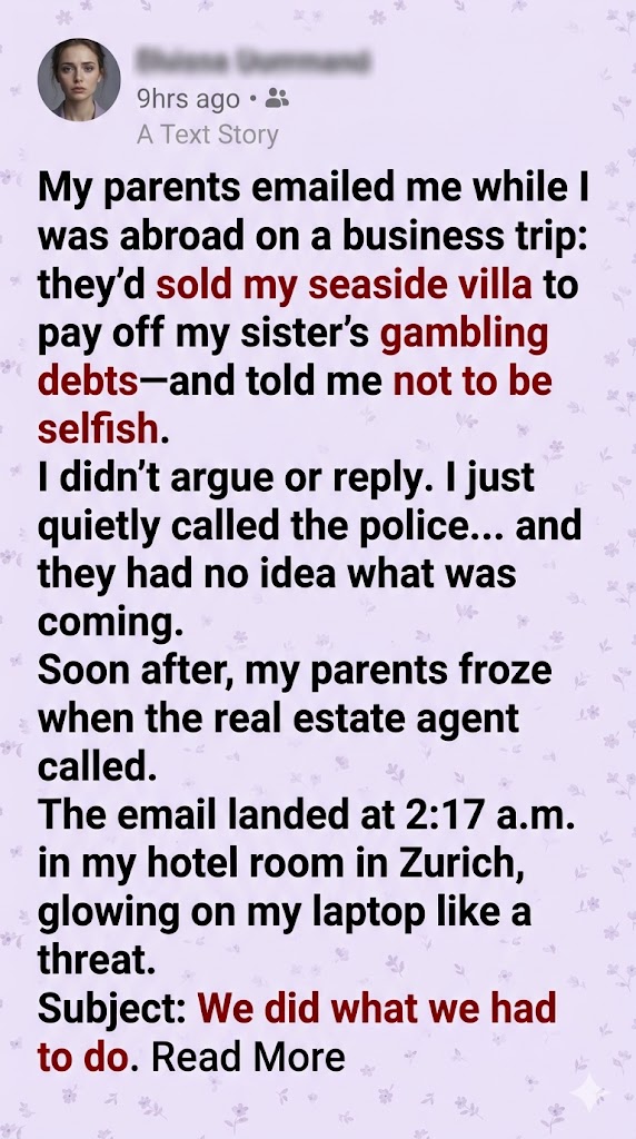 Chloe was in over her head, Alex. Dangerous people were threatening her over her debts. We knew you wouldn’t understand, so we took care of it. We used the spare keys, cleared out your personal items into storage, and finalized the sale of the seaside villa yesterday. The funds have already been transferred to clear her name. You have a great job and make plenty of money. Don’t be selfish. Family comes first.