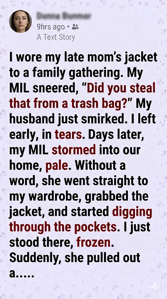 The jacket had belonged to my mother. It was simple—dark blue, slightly worn at the sleeves—but she wore it everywhere. Grocery runs, evening walks, even my college graduation. After she passed away, it became one of the few things I couldn’t let go of. That night before dinner at my in-laws, I stood in front of the mirror for a long time… then finally put it on. I just wanted to feel close to her.