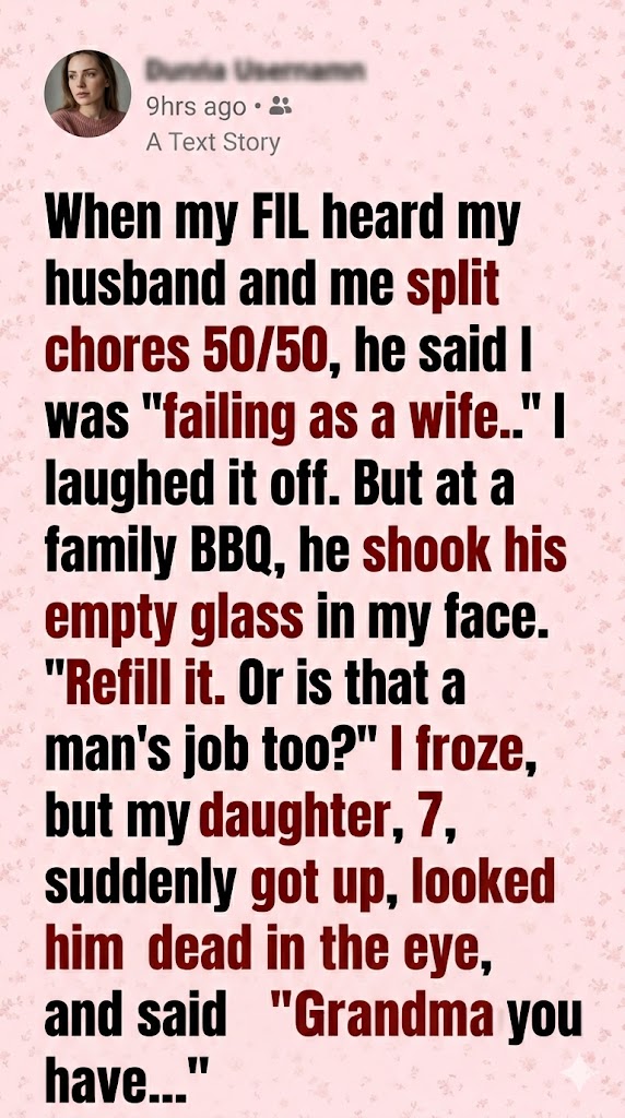 At first, her father-in-law’s comment came across as dismissive and rooted in outdated thinking. When he joked that sharing household duties meant she was “not fulfilling her role as a wife,” she chose not to respond, remaining calm and continuing to stand by her belief in equal partnership at home.