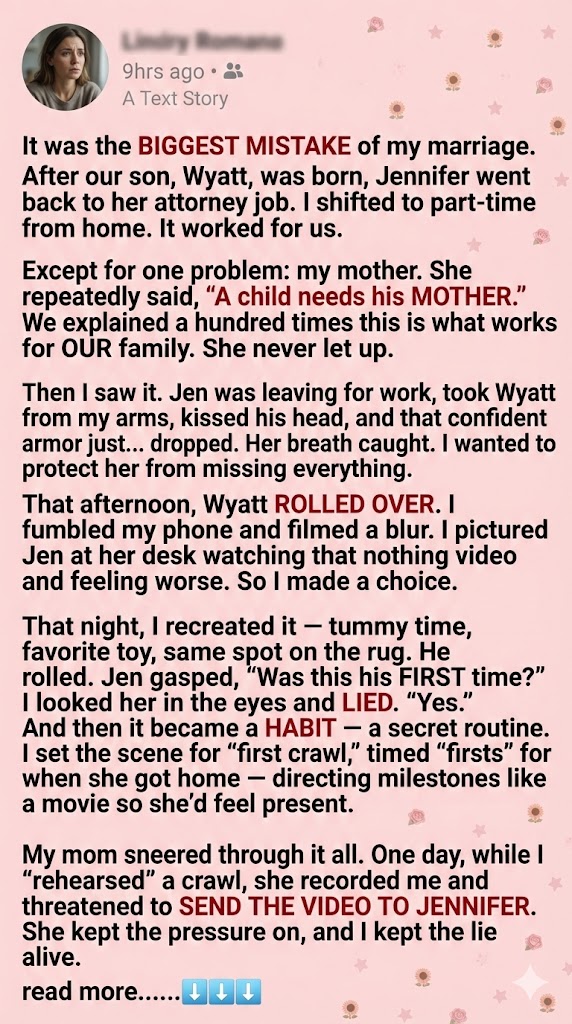I stepped in with baby Wyatt on my hip. “Jen’s job pays more, and I’ve adjusted my hours. We’re doing what works.” Mom scoffed, but Jennifer held her ground. Before leaving, Jennifer’s armor dropped. She kissed Wyatt’s head and whispered, “Promise me you’ll send videos of everything?” I promised.