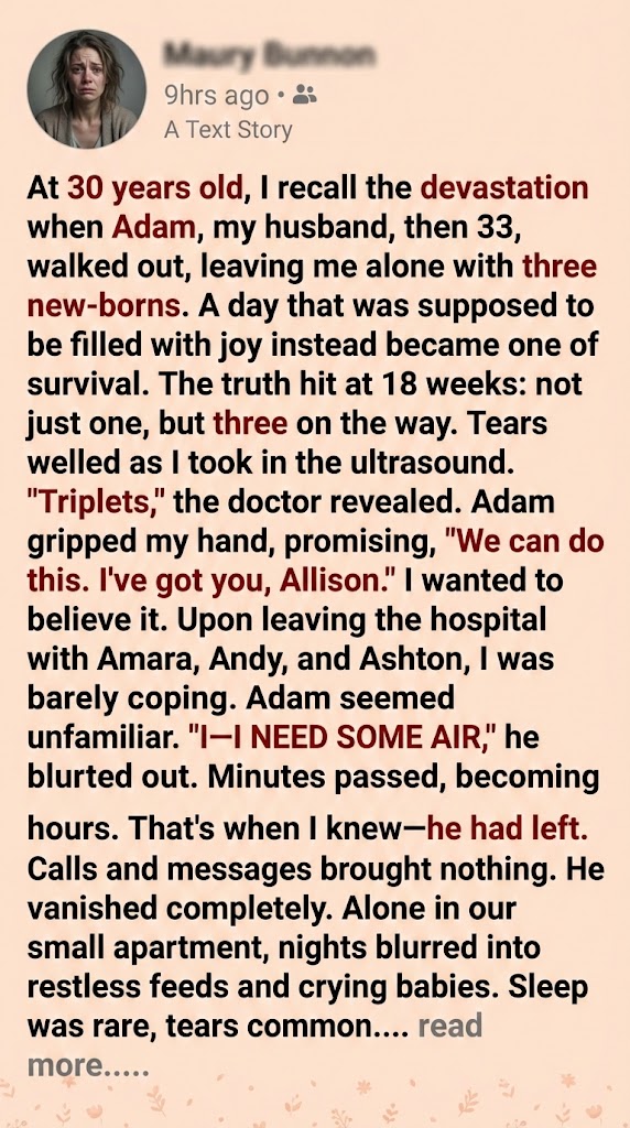 Two weeks turned into two months. The landlord came knocking, asking for rent I didn’t have. I sold my wedding ring first. Then the TV. Then the furniture Adam had picked out. I sat on the floor of an empty living room with three infants in bouncy seats, realizing that waiting for him was killing us.
