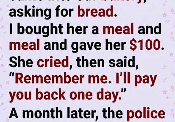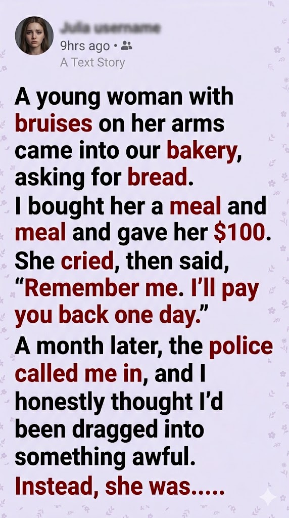 A young woman with bruises on her arms came into our bakery, asking for bread. I bought her a meal and gave her $100. She cried, then said, “Remember me. I’ll pay you back one day.” A month later, the police called me in, and I honestly thought I’d been dragged into something awful.