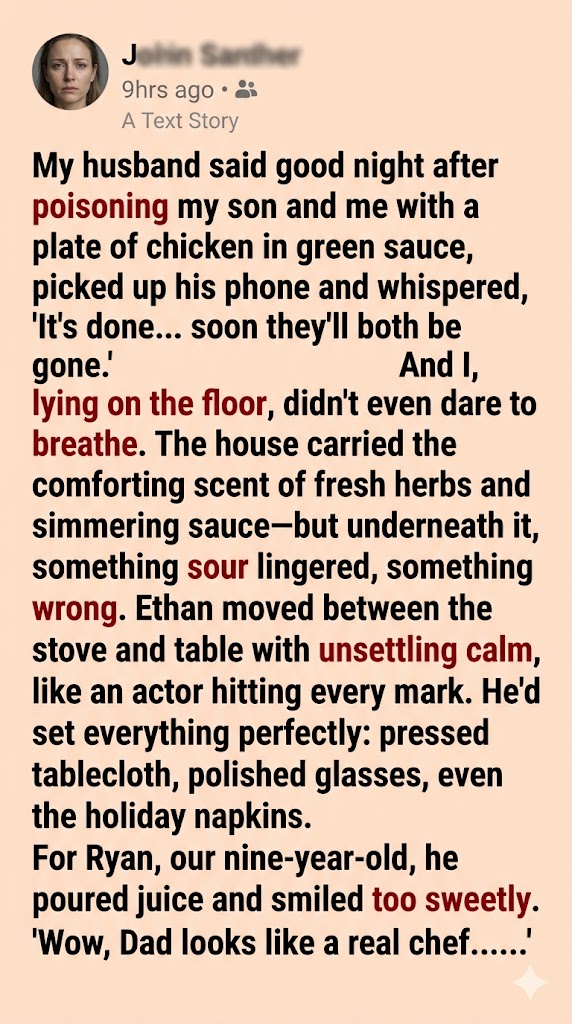 In the five seconds Ethan spent cursing and dabbing his shirt, I swapped Ryan’s poisoned chicken with a plain, un-sauced piece I had cooked for his school lunch earlier that day. I forced myself to take one minuscule bite of my own plate—just enough to sell the act. Within minutes, the room began to spin. I slumped to the floor, pulling Ryan down with me, his eyes already heavy from the mild allergy medicine I had slipped into his juice beforehand to keep him safely asleep and out of the crossfire.
