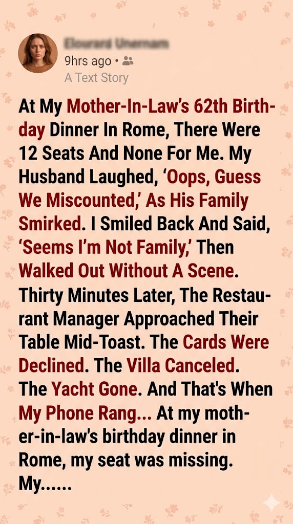 At my mother-in-law’s birthday dinner in Rome, my seat was missing. My husband, Mark, let out a loud, theatrical chuckle. “Oops, guess we miscounted,” he said, shrugging as he took his seat without so much as asking a waiter to pull up another chair.