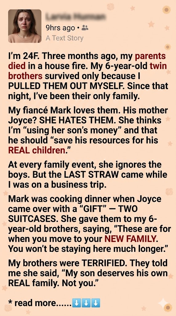 My work required me to travel for the first time since the fire—a brief, two-night absence. Mark remained home, and everything seemed normal until I walked back through our front door. Caleb and Liam immediately burst out of their room, sobbing hysterically, completely inconsolable. I dropped my luggage right there on the mat, frantically trying to decipher their terror-filled, confused words. After forcing them to take deep, shuddering breaths, the horrifying story finally unfolded. Grandma Joyce had visited under the pretense of bearing “gifts” while Mark was busy cooking. She had presented the boys with two small, perfectly packed suitcases, complete with their own clothes and toothbrushes. Then, with wicked composure, she delivered the devastating lie: “These are for when you move to your new family soon.” She further poisoned their minds by claiming, “Your sister only takes care of you because she feels guilty.” She left them weeping and panicked, knowing precisely what profound fear she had inflicted upon my boys.